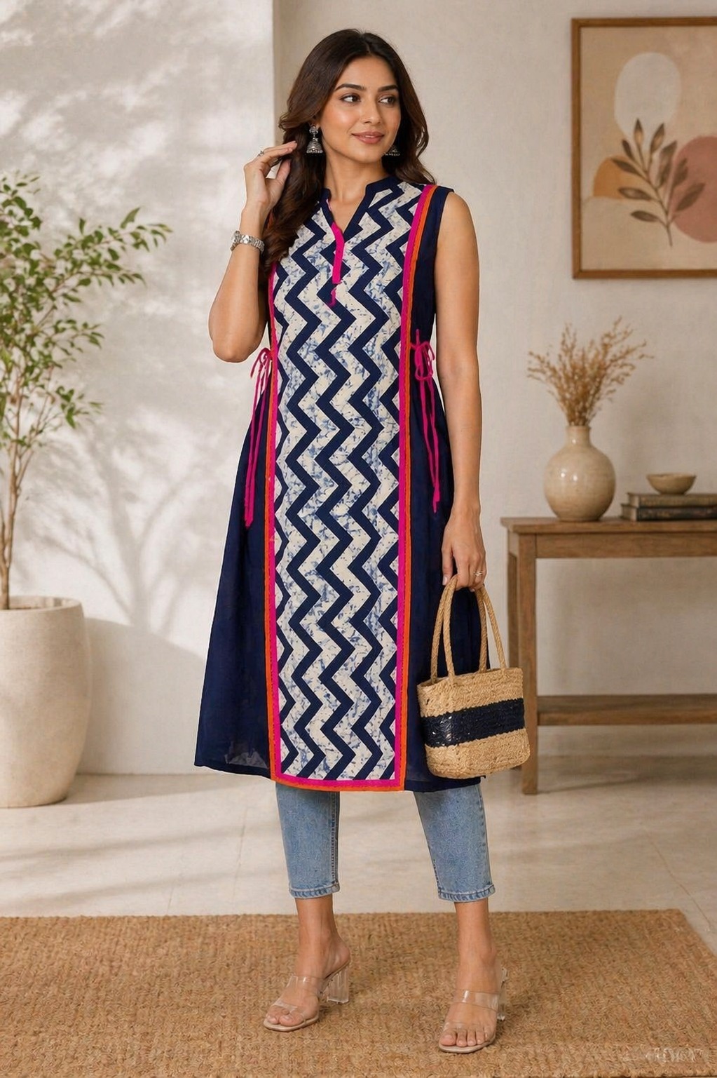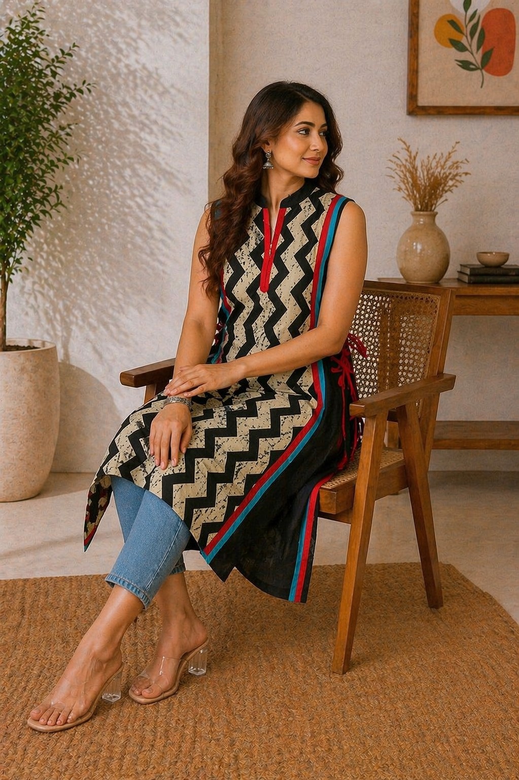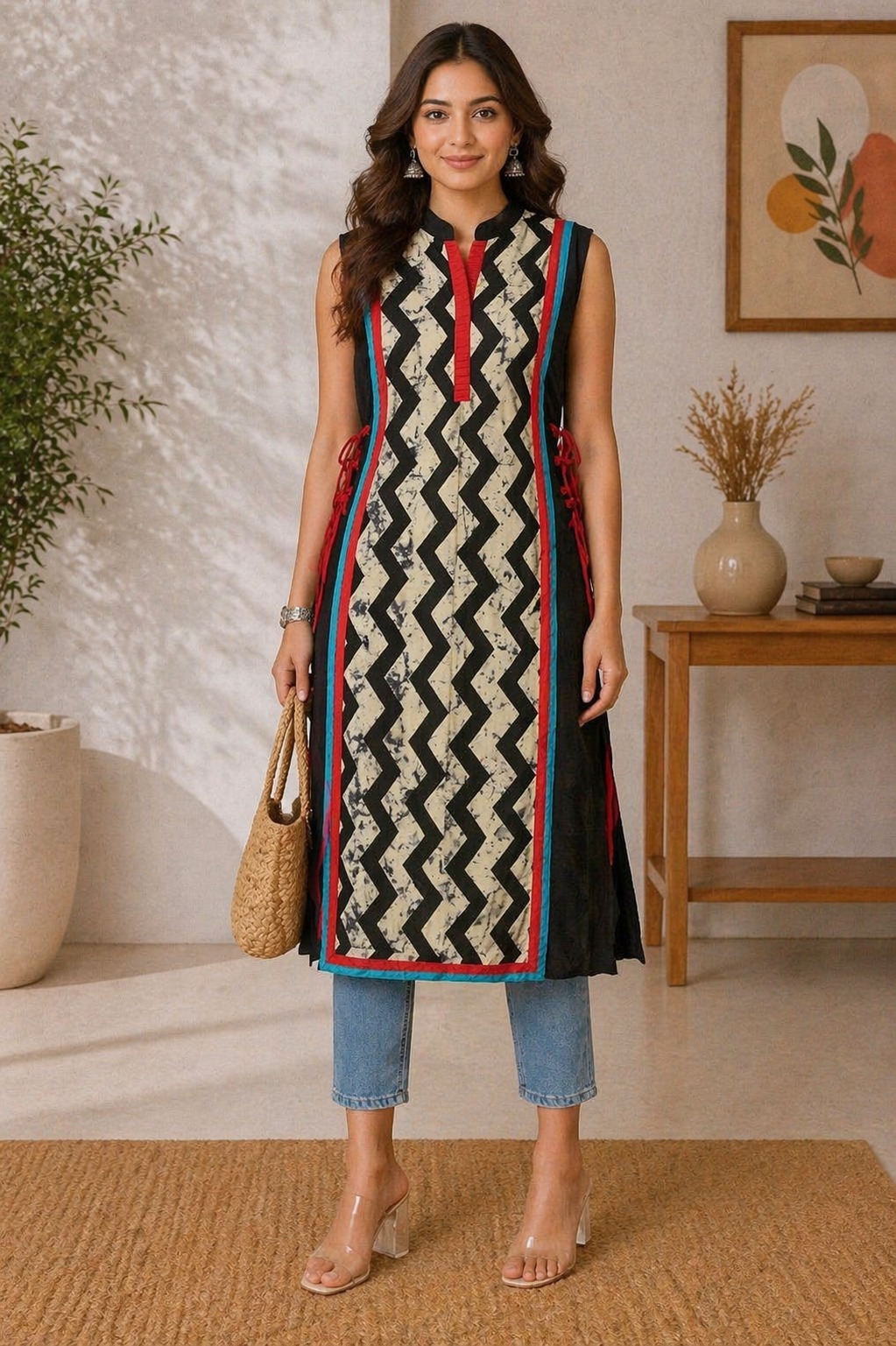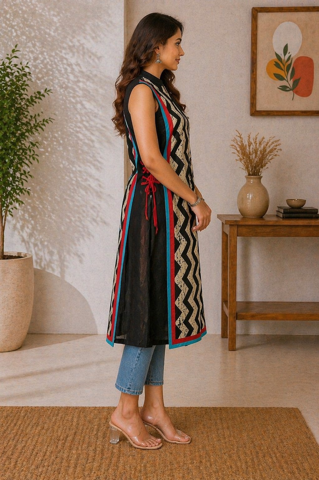 • Modern Ethnic Look: Sleeveless straight-cut kurta with side tie-up detailing
