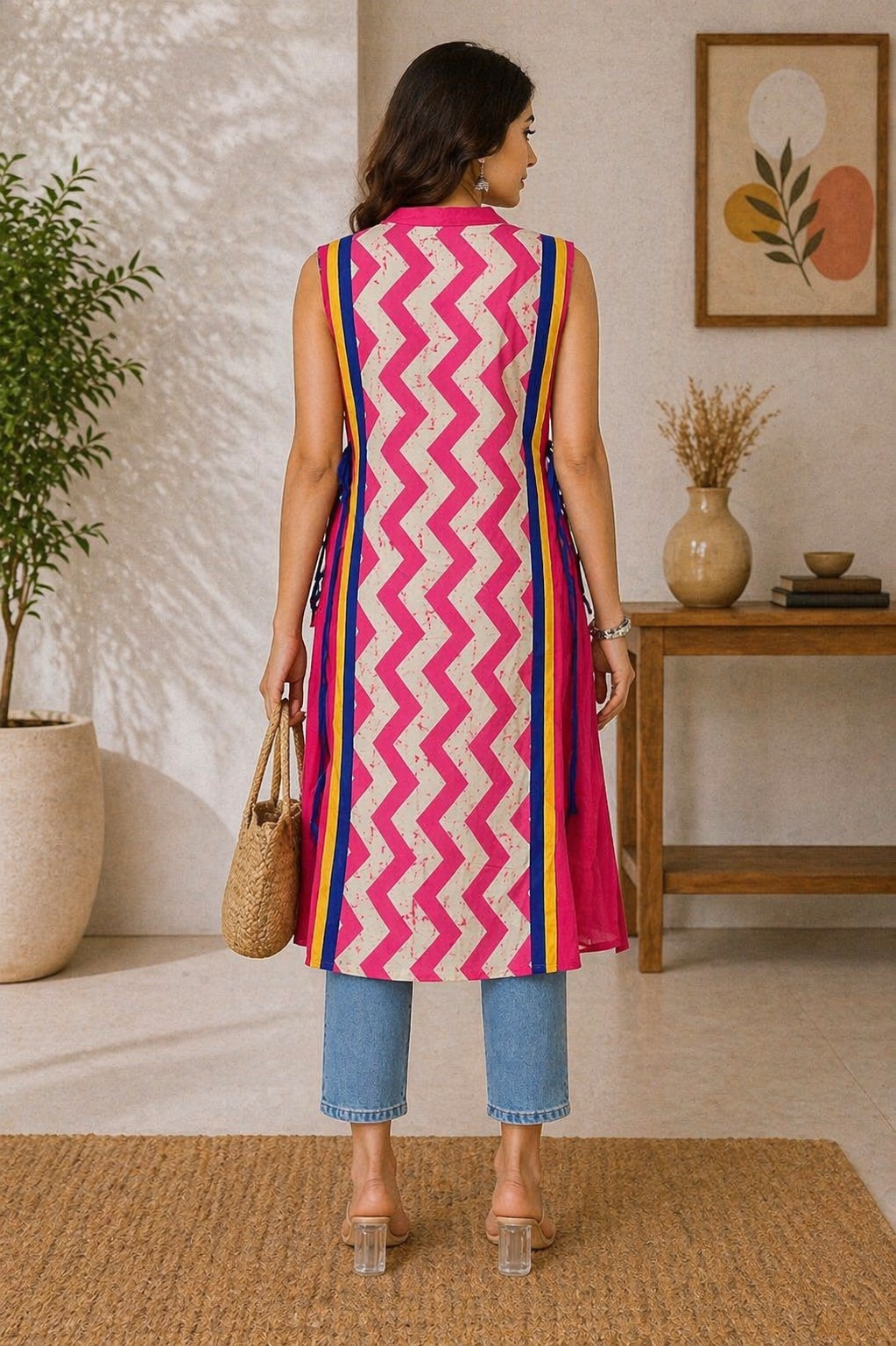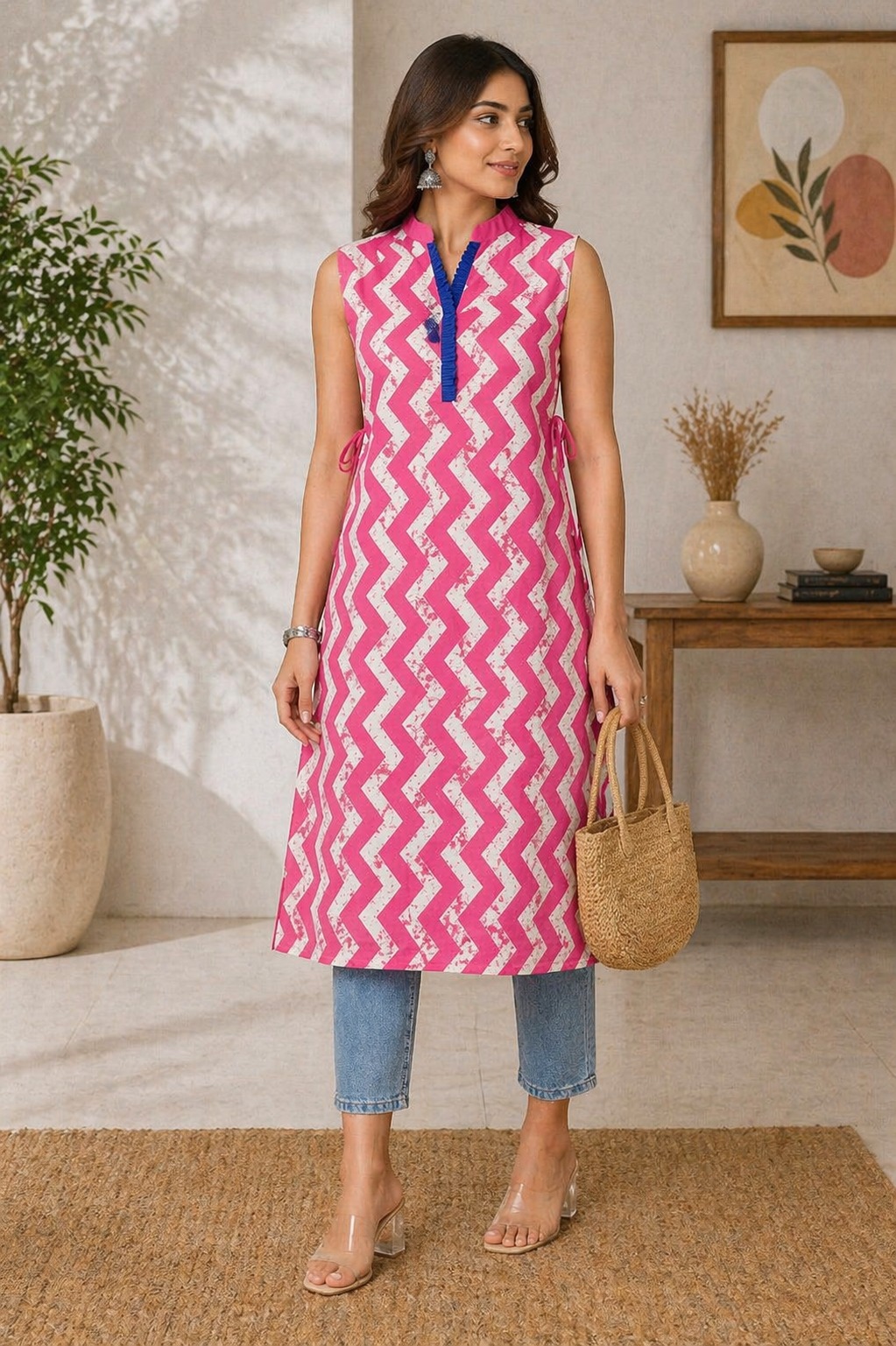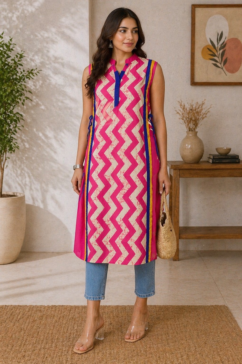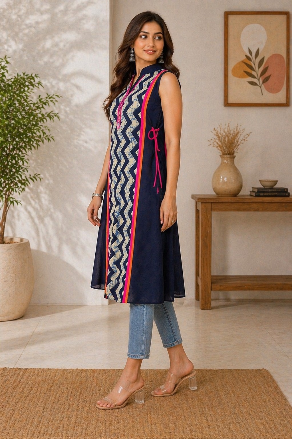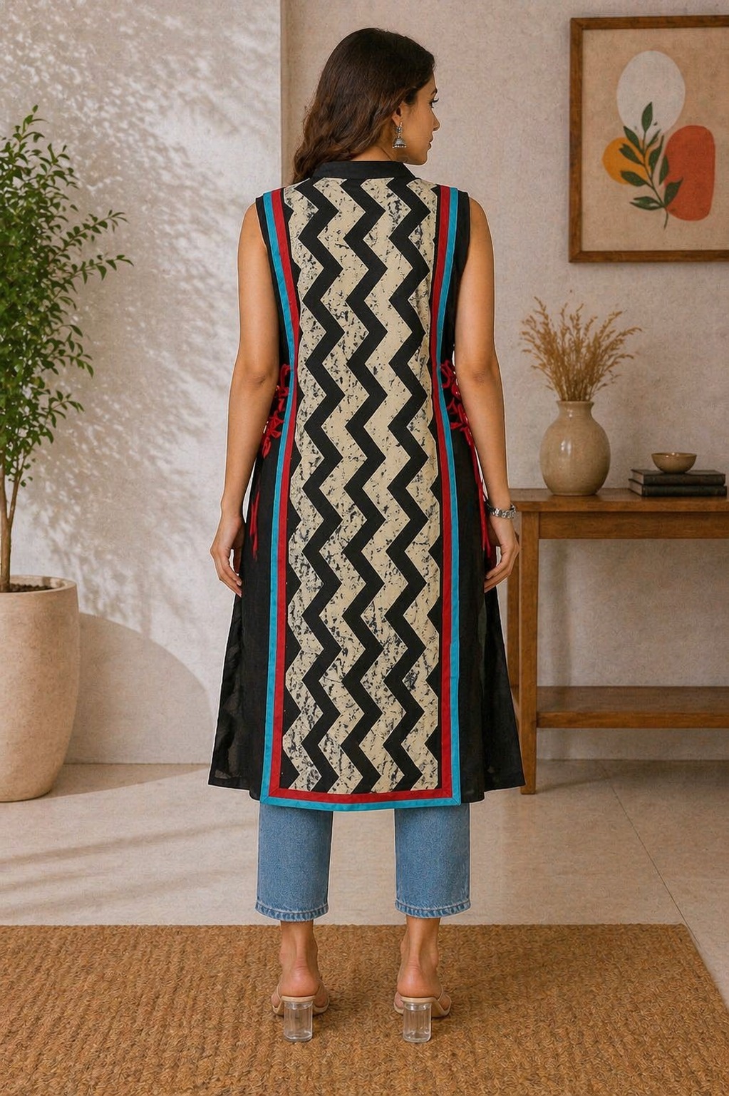 • Modern Ethnic Look: Sleeveless straight-cut kurta with side tie-up detailing