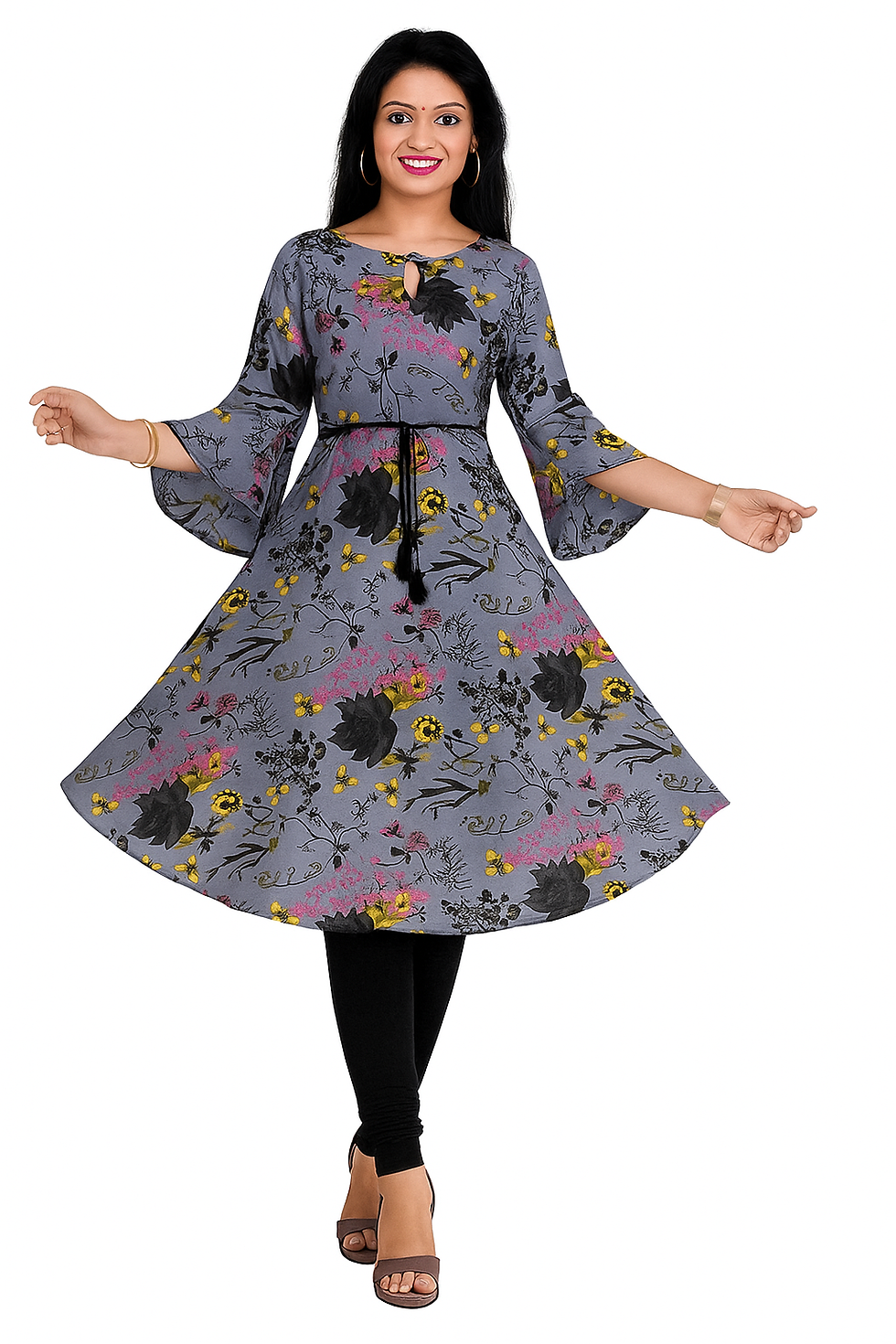 Women's Stylish Grey Floral Printed Rayon A-line Anarkali Kurti with Bell Sleeve